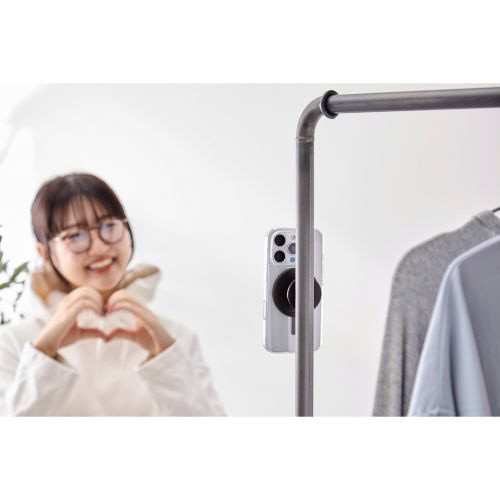 磁石が付く場所などにスマートフォンを簡単に固定可能。すぐに撮影できて、使用後の取り外しもスムーズです。