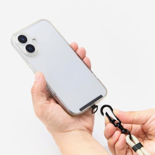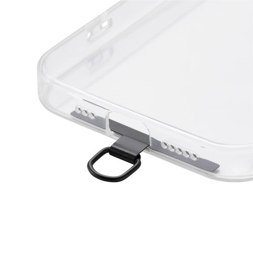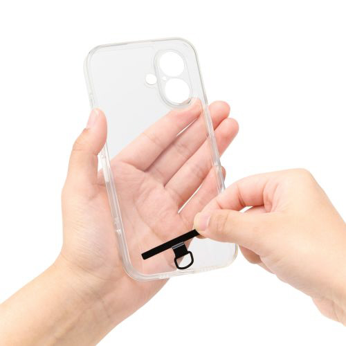 ケースにストラップホールがなくても、付属のストラップホールシートをスマートフォンとケースの間に挟むだけで使用できます。
