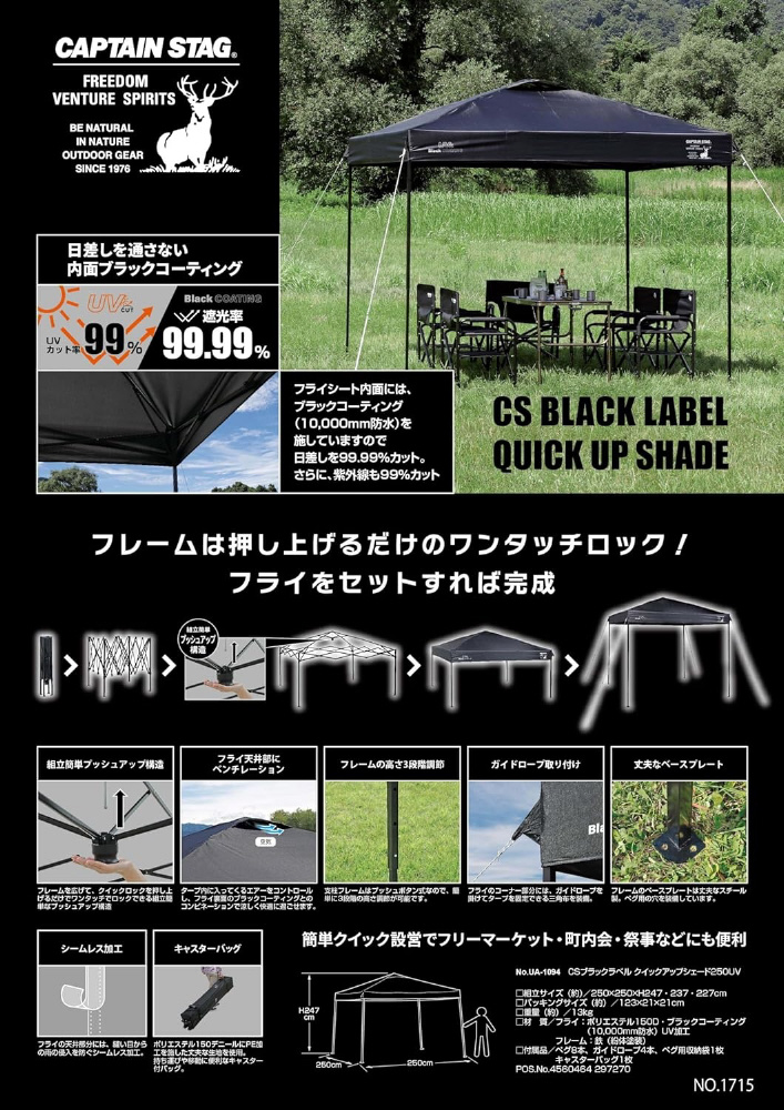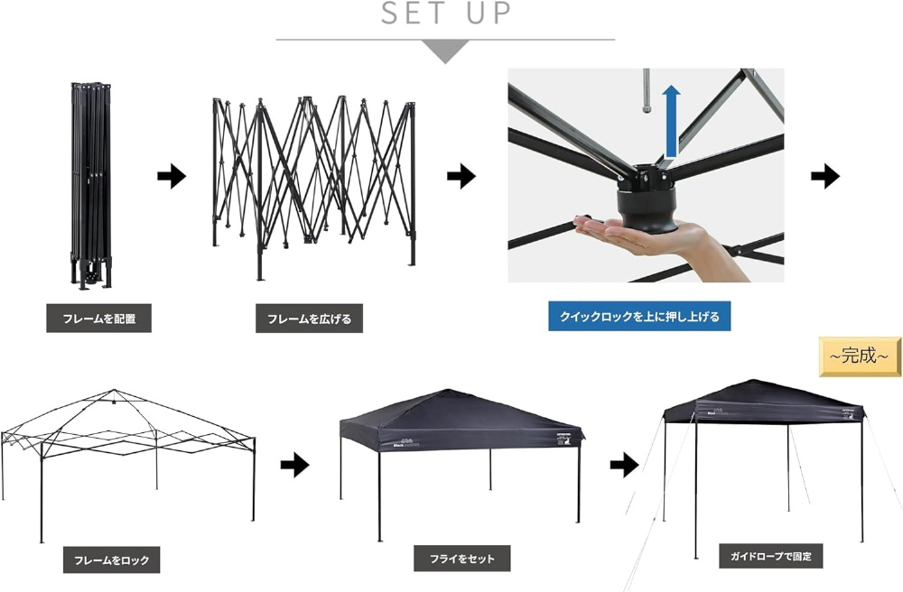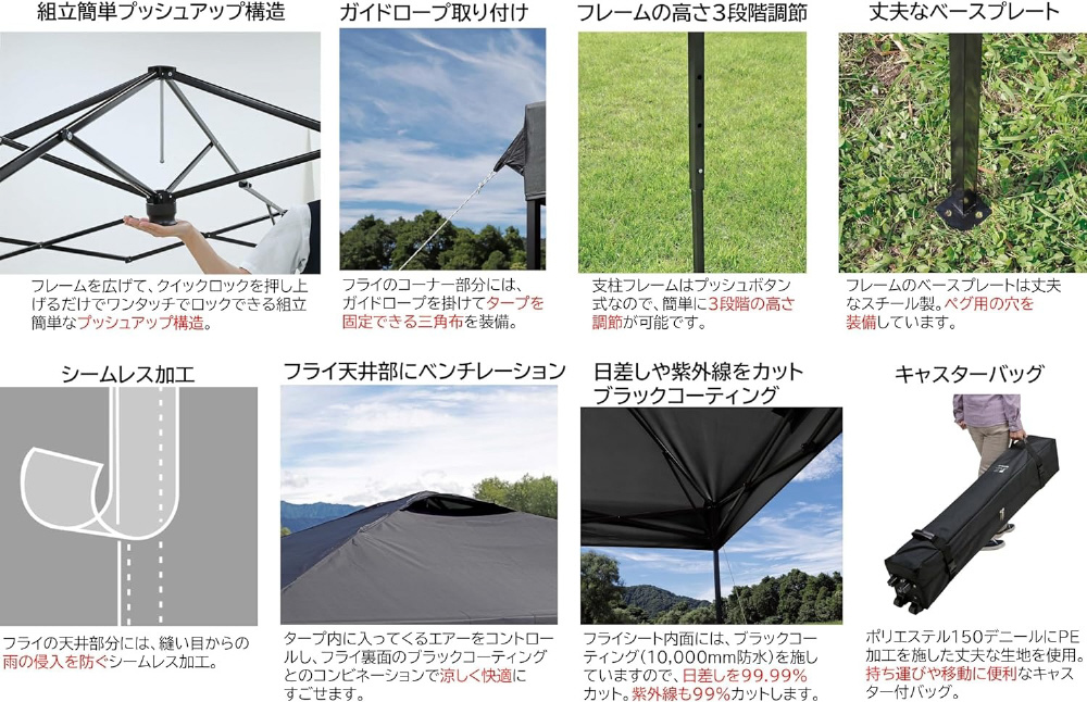 材質 フライ=ポリエステル150D・ブラックコーティング(10000mm防水)UV加工、フレーム=鉄(粉体塗装)