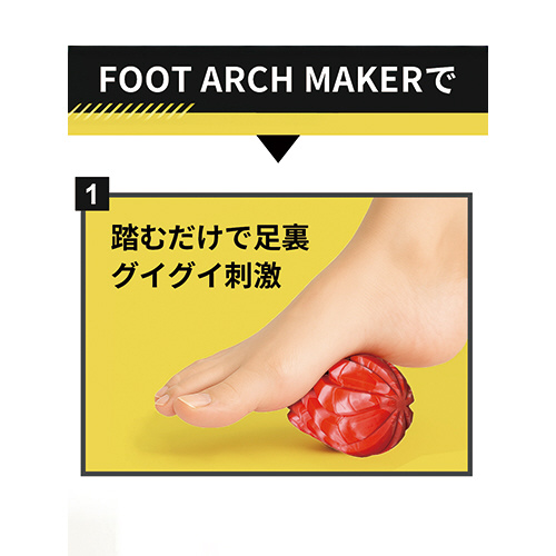 フットアーチメーカーは、内側縦アーチ・外側縦アーチ・横アーチという足裏に存在する3つのアーチすべてに同時アプローチするフットケアツールです。土踏まずだけを刺激する従来品とは異なり、足裏全体を立体的に捉えた設計で、バランスよく心地よい刺激を与えます。