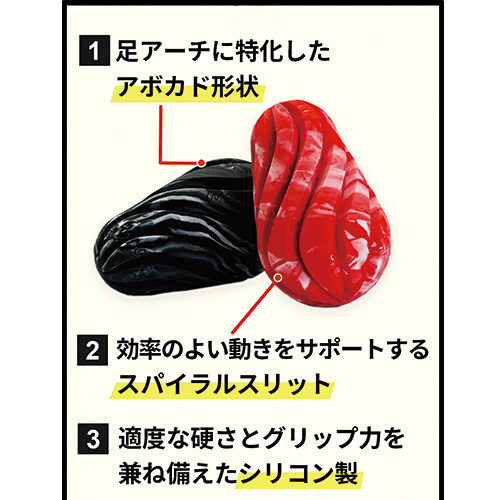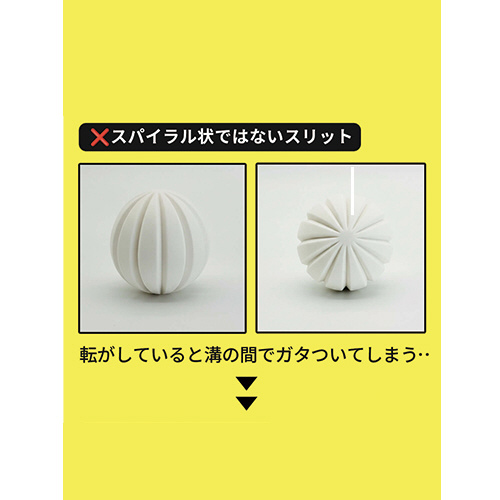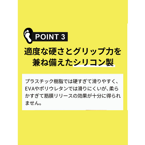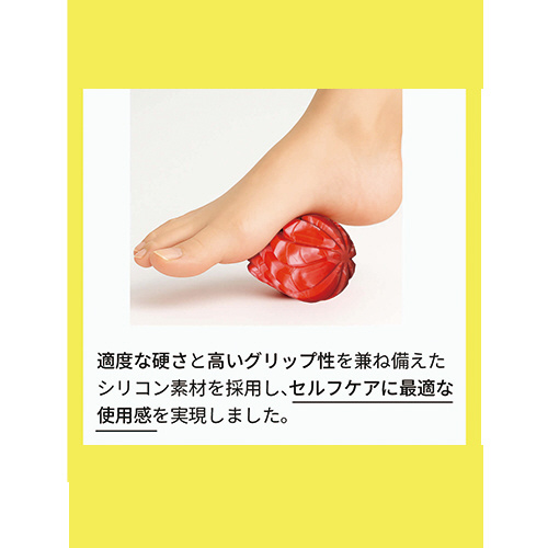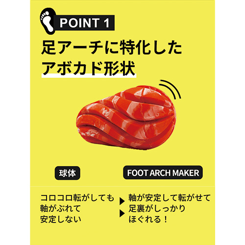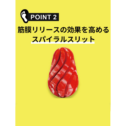形状は、足裏にフィットしやすい安定感のあるアボカド型。球体では逃げやすかった足の側面までしっかりと踏み込むことができ、内側・外側アーチにも自然に圧がかかります。さらに、転がした際のブレを抑えるスパイラルスリット構造により、滑らかでリズムの良い使用感を実現しました。
