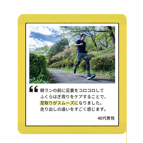 本品の太い部分を足の外側にあて、前後に転がしてください。