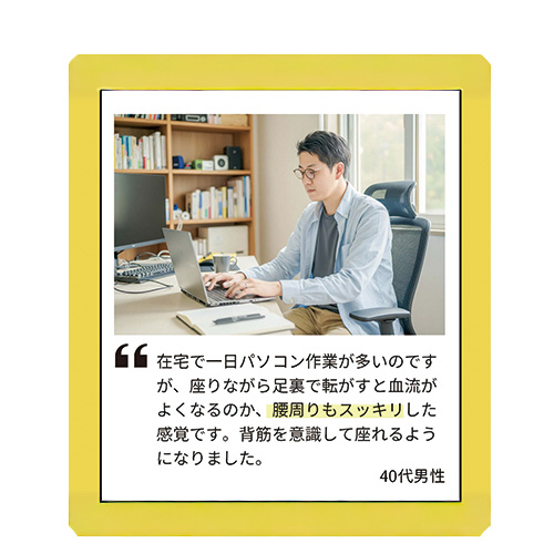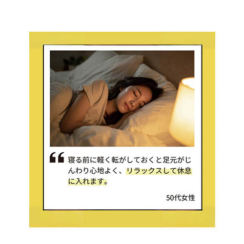 踏んで、転がすだけ。テレビを見ながら、デスクワークの合間に、立ち仕事の後にも無理なく取り入れられるフットケアです。
