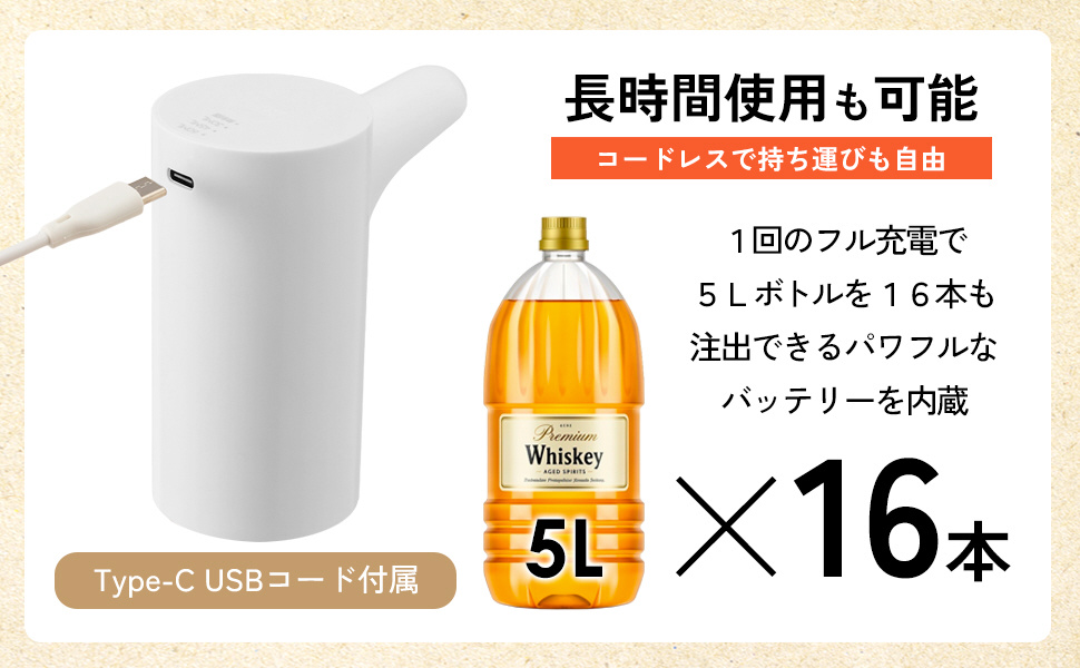 ■ USB Type-C充電対応でコードレス充電式可能。場所を選ばずどこでも使用できます。充電時間 約3〜6時間 フル充電で4Lペットボトル約12本分を自動で注ぐことができます