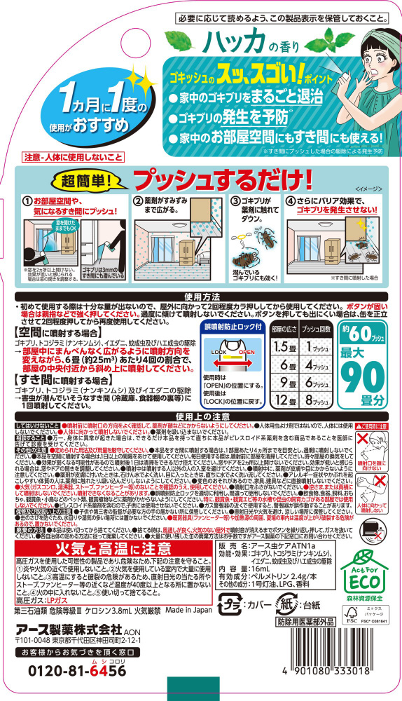 【効能・効果】ゴキブリ、トコジラミ(ナンキンムシ)、イエダニ、蚊成虫及びハエ成虫の駆除
