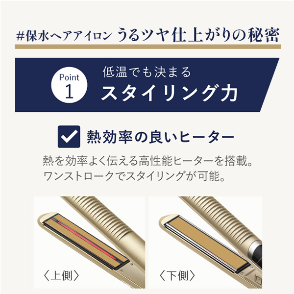 プレートの電極にイオン電極を配置。美顔器の技術を応用した独自浸透技術「モイスチャーパルス」を搭載。髪内部にうるおいを届け、髪に艶をまとわせます。滑らせるだけで髪本来の美しさが瞬時によみがえります。