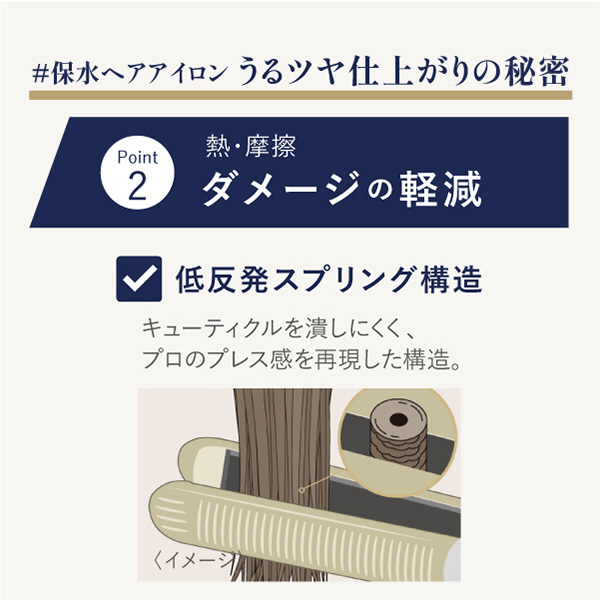 プロの絶妙なプレスの力を再現した「低反発スプリング構造」のプレートで、髪一本一本をふんわり包み込み、キューティクルをつぶしにくい設計に。プレートには微細なトルマリンパウダーを配合し、なめらかなすべりで摩擦によるダメージを低減します。また、プレートの中心に切り込みを入れた「ダメージカットライン」により、過剰な熱と水蒸気を逃し、髪へのダメージを抑制します。