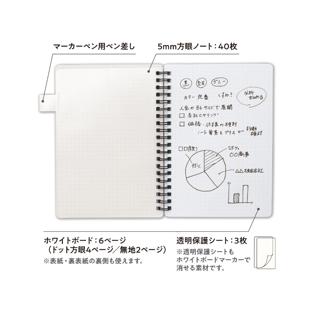 何度でも書いて消せるホワイトボード6ページと通常の紙の5mm方眼ノート40枚が一体化。