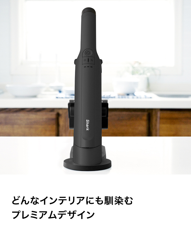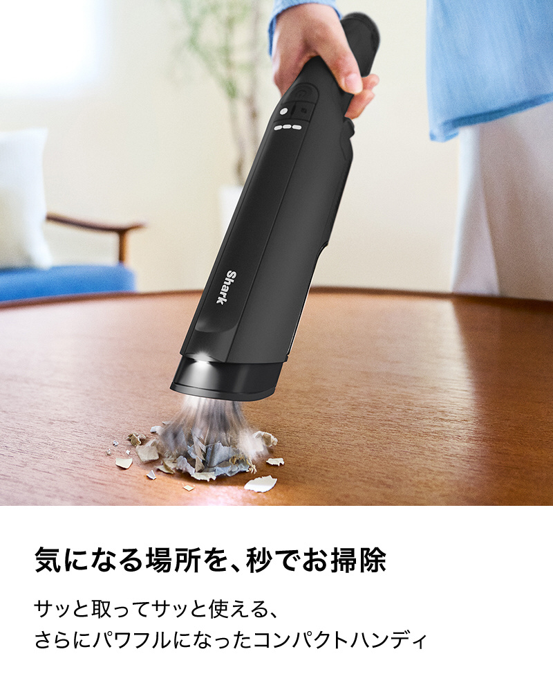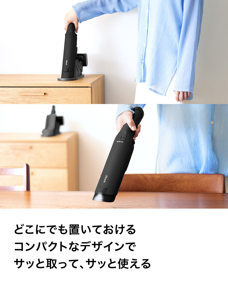 シャークのベストセラーEVOPOWERの設計を一から見直し、三世代目にフルモデルチェンジ。机や棚の上に置いておけるコンパクトなデザインだから、サッと取って気になる場所を、秒でお掃除。