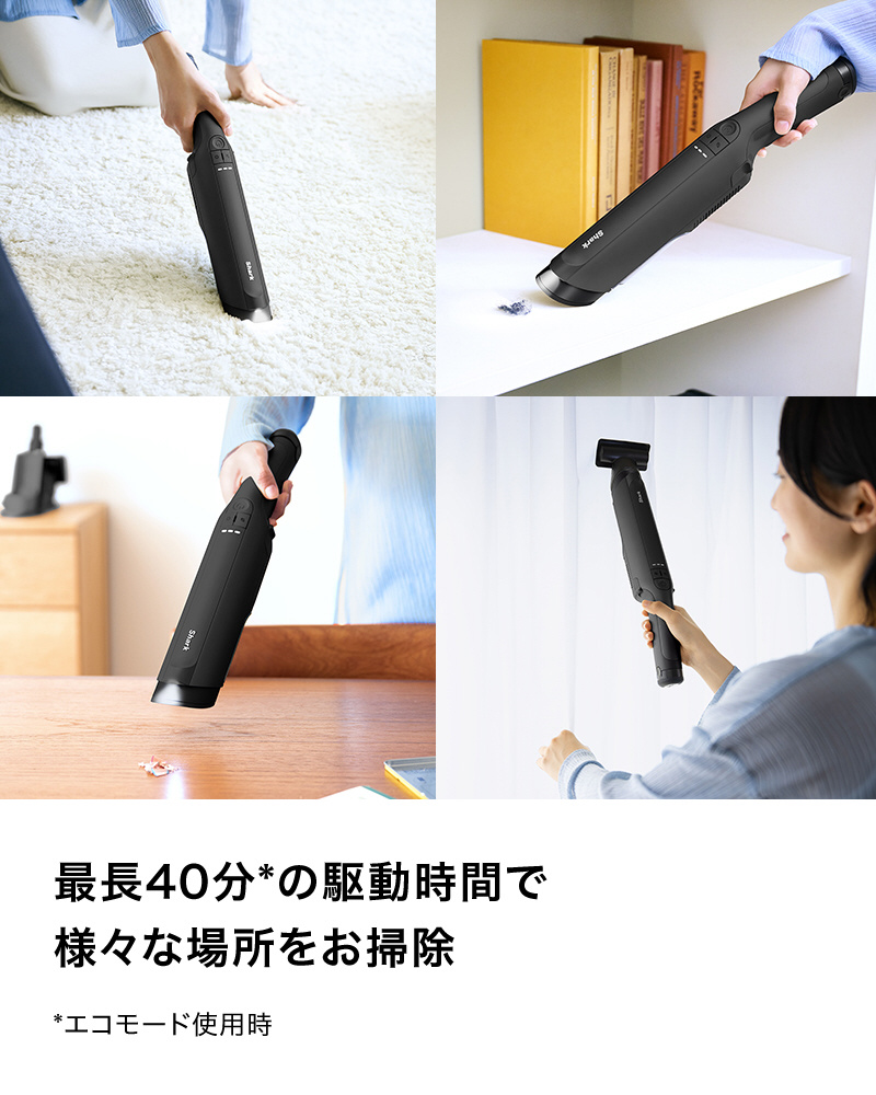 エコモード時に最大40分の駆動時間で、家中さまざまな場所を充電切れの心配をすることなく、満足いくまでお掃除が可能。ハンディだから部屋間の移動もラクラク。