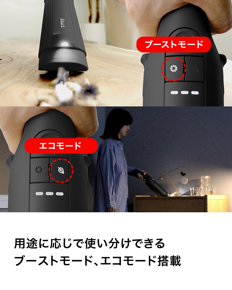 より吸引力のあるブーストモード、より作動音の少ないエコモードを搭載し、シーンにあわせた使い分けで用途が広がる。