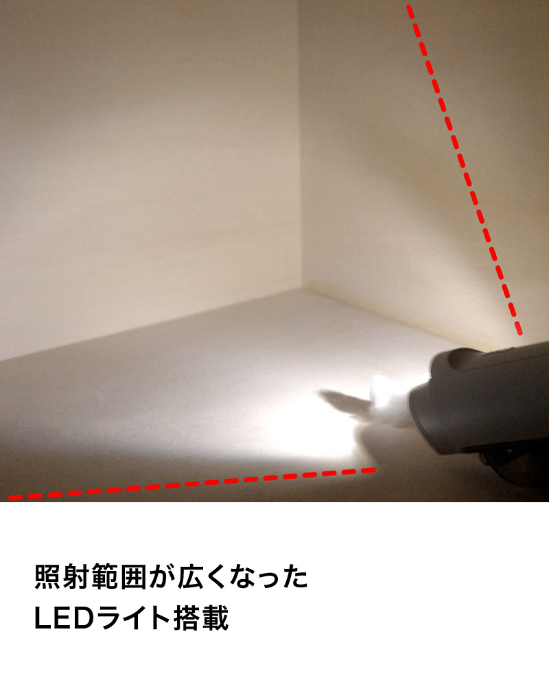 LEDヘッドライト搭載だから、薄暗い所もゴミを確認しながらお掃除ができるため、見えづらい家具の隙間のゴミも見逃さずお掃除が可能。