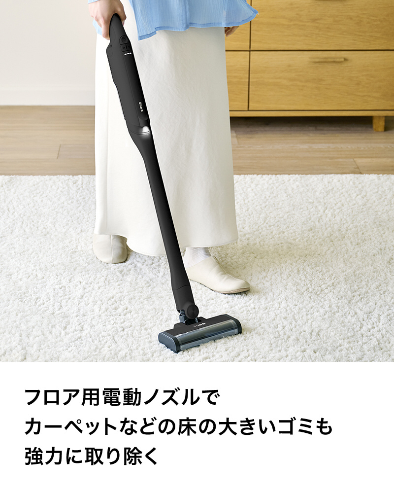 床からもサッとゴミが取れる電動ノズル付き。カーペットやラグのゴミも簡単にお掃除