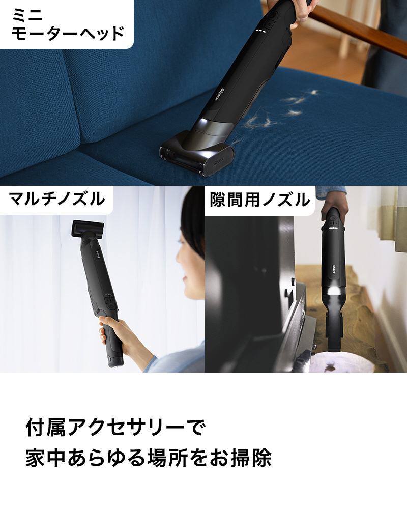 付属のアクセサリーを使用することでリビング、キッチン、寝室、洗面台など狭い箇所から広い床面まで、家中の様々な場所や汚れに合ったお掃除が可能。ハンディだから部屋間の持ち運びもラクラクで、これ一台でいつでも部屋を清潔に保てる。