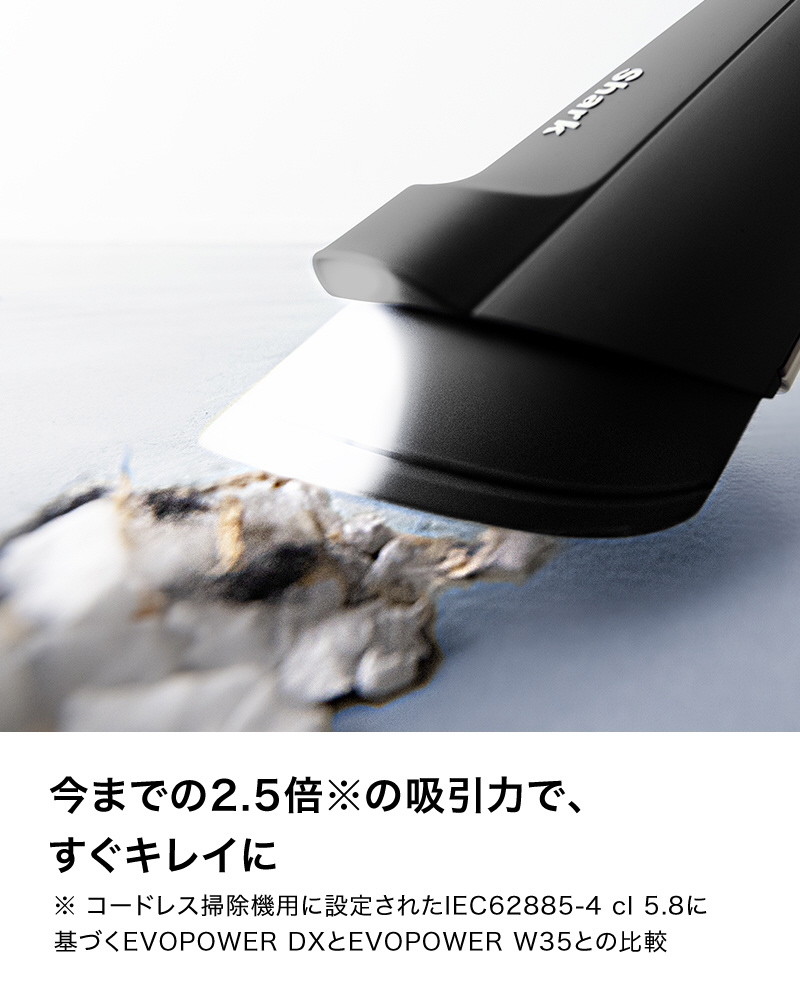 EVOPOWER W35と比較し吸引力が2.5倍。ハンディクリーナーなのに大きなゴミも細かいほこりもパワフルに取り除いて部屋中隅々まできれいに。