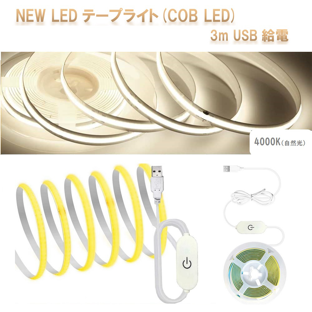 NEW LEDテープライトCOB LED 3m USB給電(4000K ゴールド)