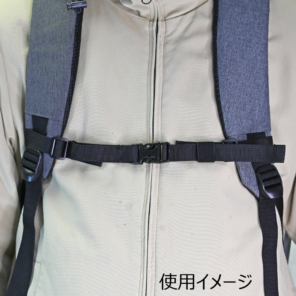 移動中のリュックのずれ落ちを防止するチェストベルト。胸の前で留めて固定することで、リュックやリュックベルトのずれ落ちを防ぎます。ワンタッチのバックルで簡単に着脱できます。前傾姿勢でずれやすい自転車での通勤や通学にも。