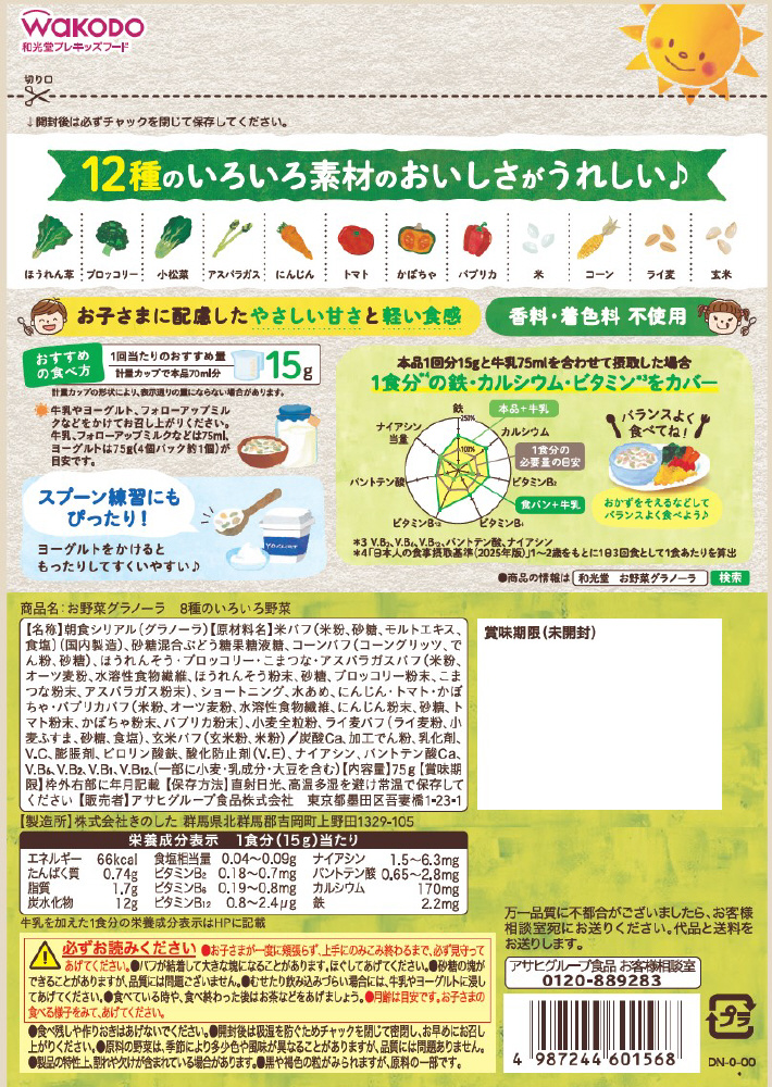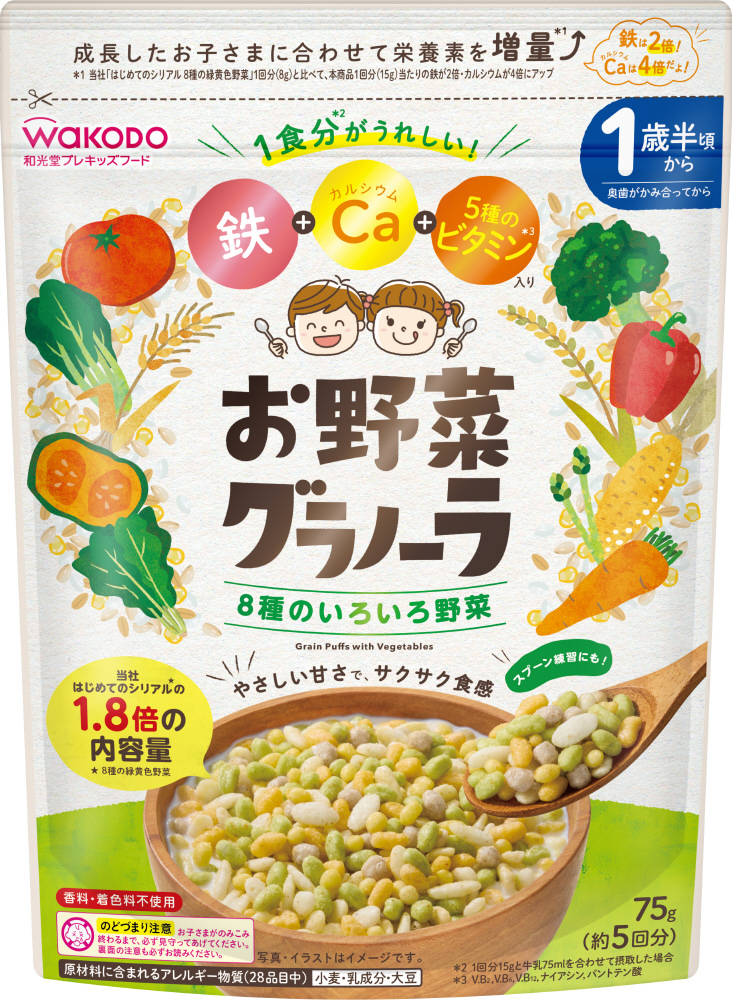 ■12種のいろいろ素材のグラノーラ:親の意向の高い野菜やくだものを使用したいろいろ素材。8種の野菜と4種の穀物入り。一度に手軽にバリエーション豊かな素材を食べさせることができます。■鉄・カルシウム・5種*1のビタミンが1食分*2摂れる:牛乳75mlと一緒に食べることで、イヤイヤ期や偏食に悩むプレキッズ前期のママをサポートする栄養設計■成長に合わせてステップアップ:当社「はじめてのシリアル」1歳品に比べて、内容量は1.8倍、鉄は2倍・Caは4倍に増量■お子さまに配慮したやさしい甘さ:他社品子ども向けシリアルの甘さが不安なママも、安心してあげられるやさしい甘さ。サクサク食感でお子さまも食べやすい*1 V.B2、V. B6、V. B12、パントテン酸、ナイアシン*2「日本人の食事摂取基準(2025年版)」1〜2歳をもとに1日3回食として1食あたりを算出