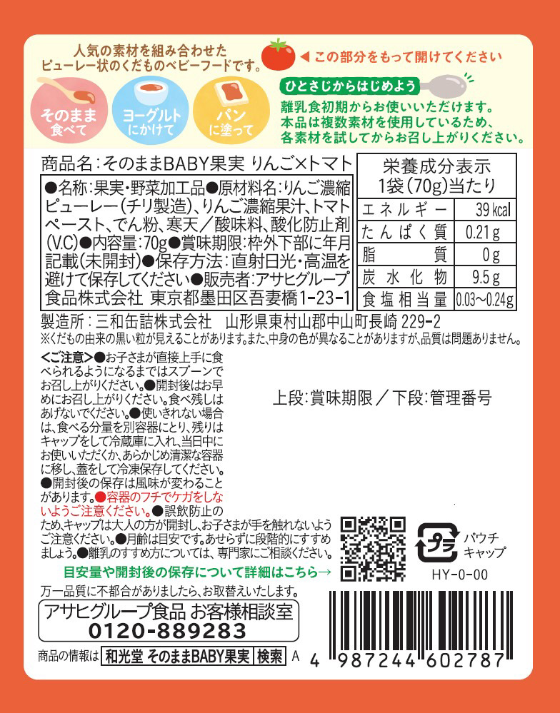 ・くだものを裏ごししたような食感・果実・野菜100%相当、複数のくだものと野菜入り・使いやすいスパウトパウチ・スプーンで5か月頃から、直接食べで1歳頃から・そのままはもちろん、ヨーグルトにかけたり、パンに塗ったり使い方いろいろ・朝食時やおやつ、外出先等、様々なシーンで使える・やさしい甘さ・常温保存可能(未開封時)