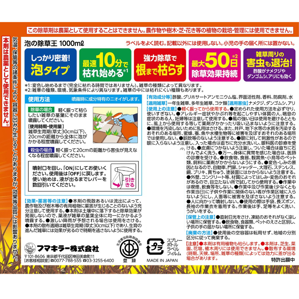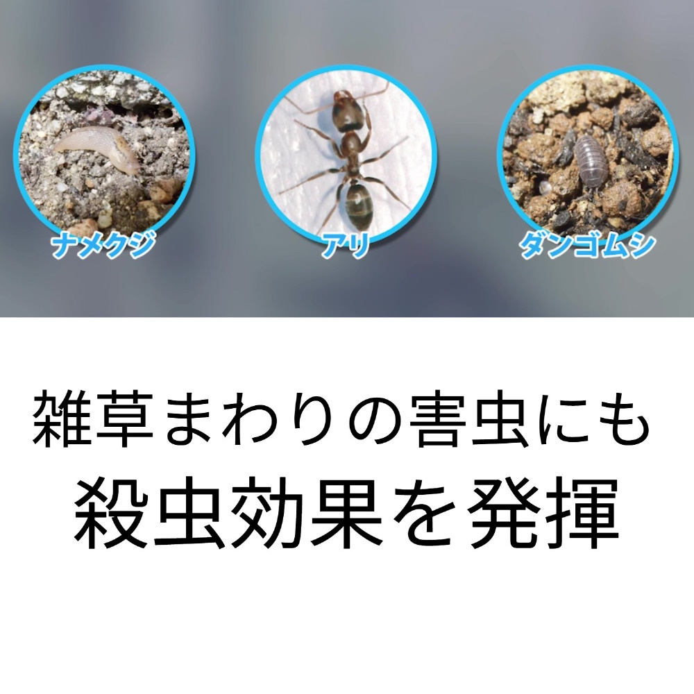 ●ナメクジ、ダンゴムシ、アリも退治雑草まわりの害虫にも殺虫効果を発揮します。この除草剤は農薬として使用することはできません。農作物や樹木・芝・花き等の植物の栽培・管理には使用できません。※有効成分:酢酸、グリホサートアンモニウム塩※適用雑草:一年生雑草、多年生雑草、コケ類