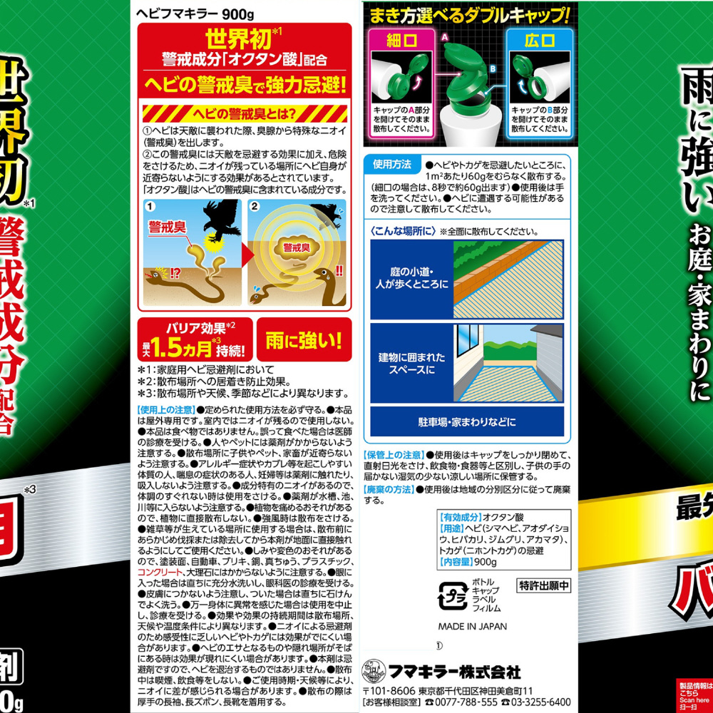 ●世界初※警戒成分〈オクタン酸〉配合ヘビが天敵に襲われた際に発する警戒臭を利用した有効成分〈オクタン酸〉で、ヘビやトカゲを強力に忌避します。※家庭用ヘビ忌避剤において