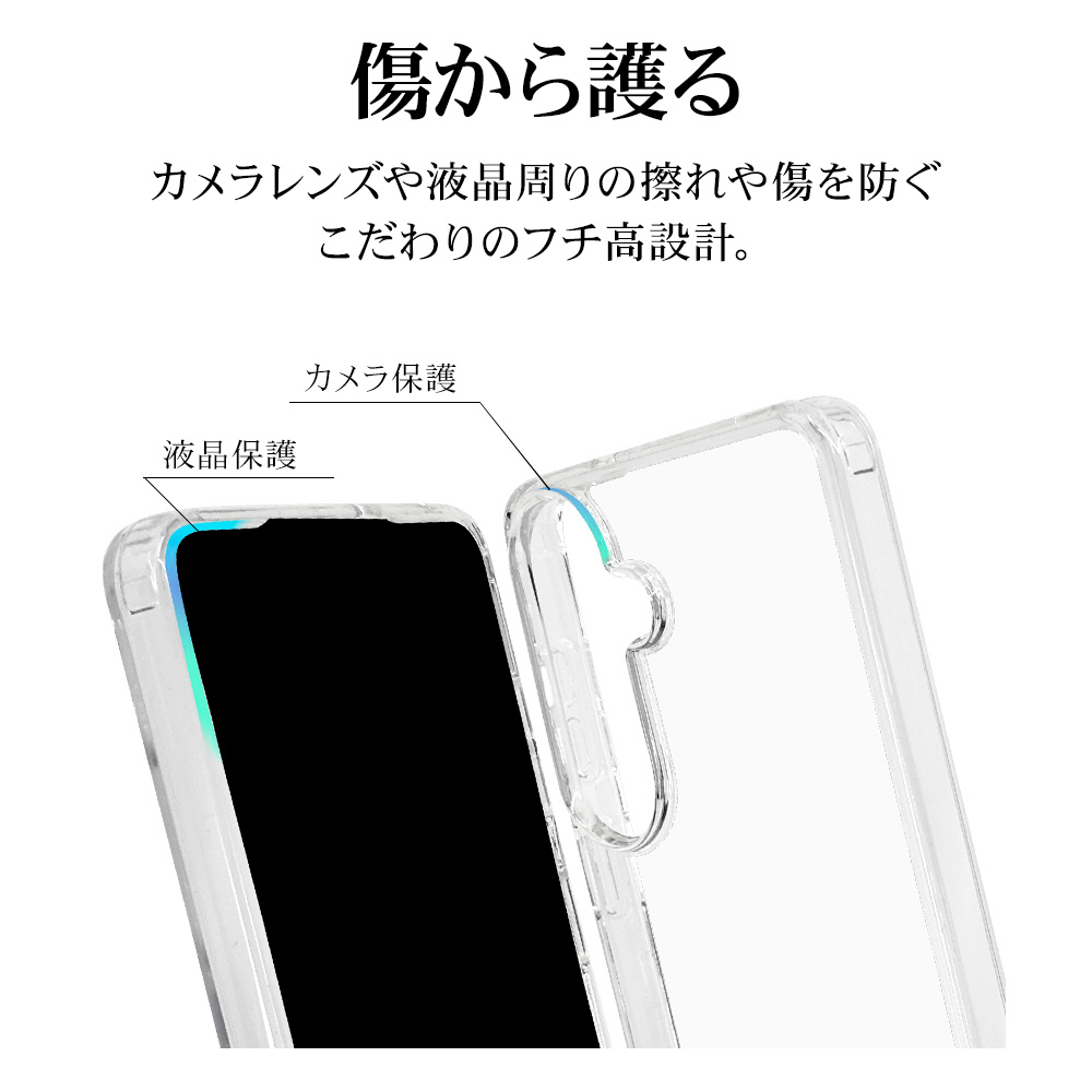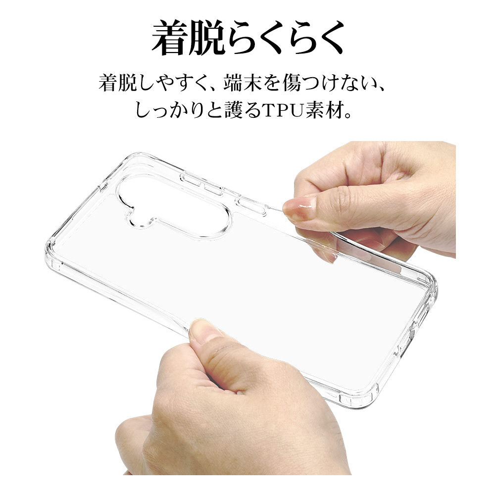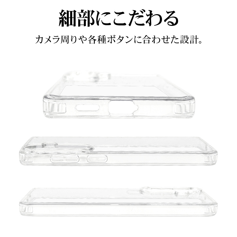 ●側面は弾力と柔軟性を兼ね備えたTPU素材で端末を衝撃から保護し、着脱も簡単です。※衝撃吸収については、一般的なポリカーボネート製ケースと比較した自社検証結果で、無破損、無故障を保証するものではありません。