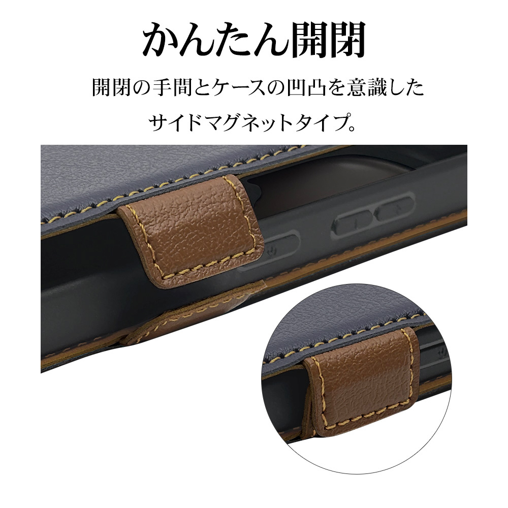 液晶画面側と背面側の両面を保護できる薄型で持ちやすい手帳型ケースです。