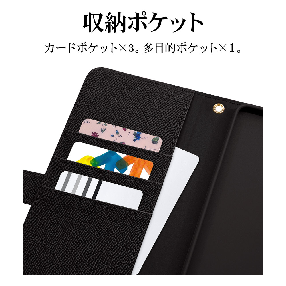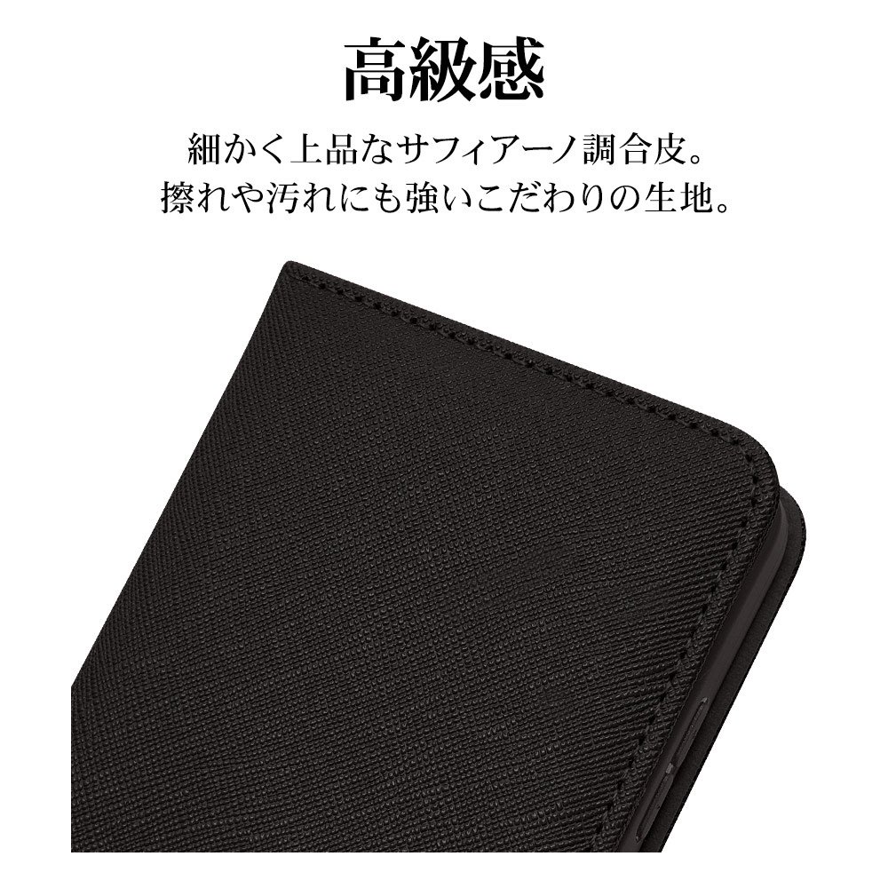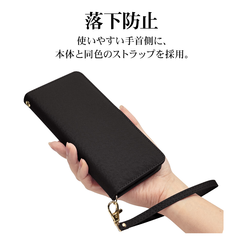 液晶画面側と背面側の両面を保護できるハンドストラップ付きの手帳型ケースです。