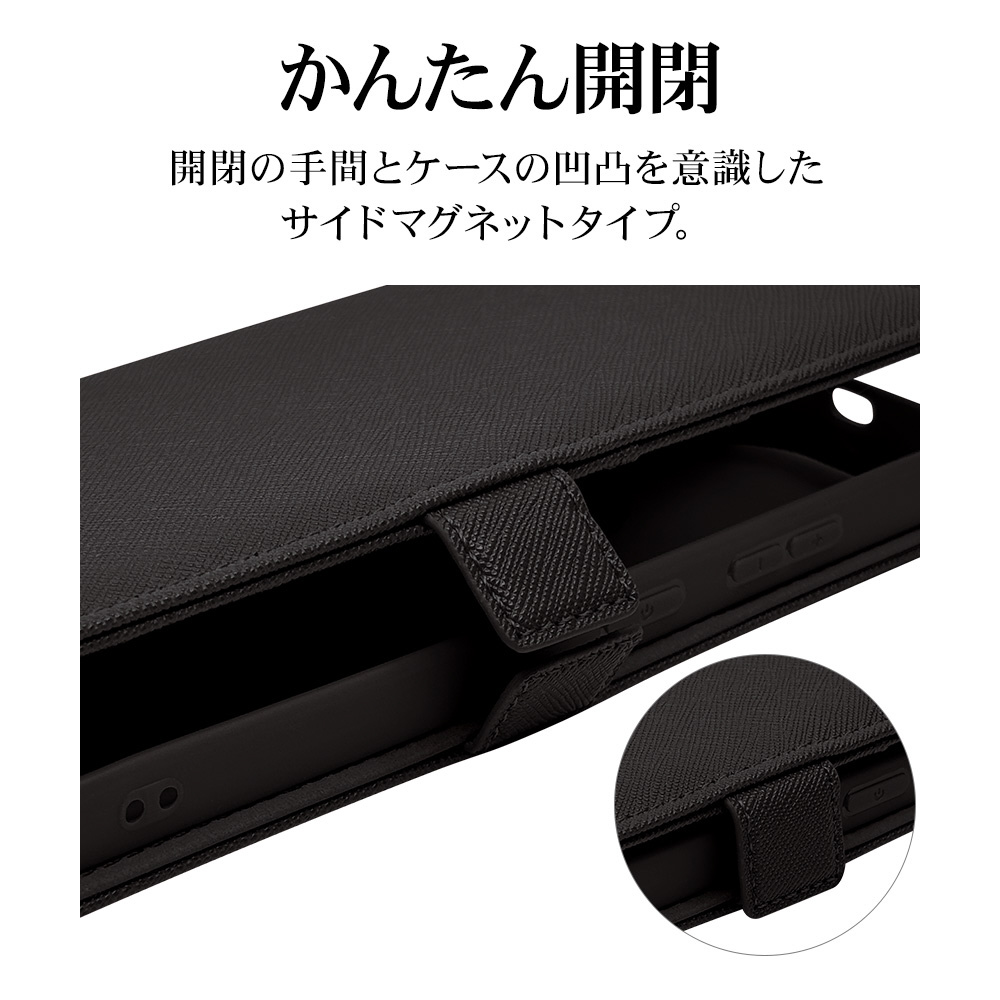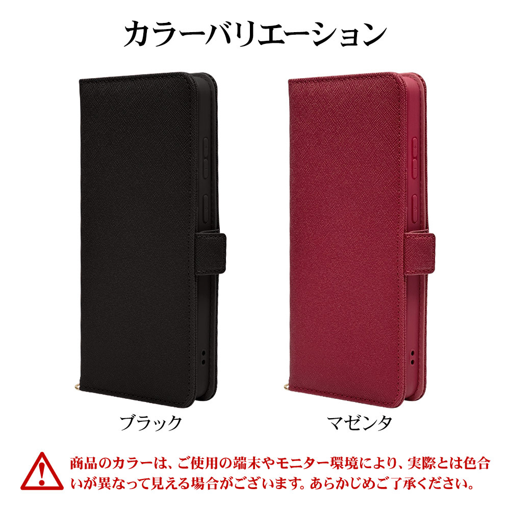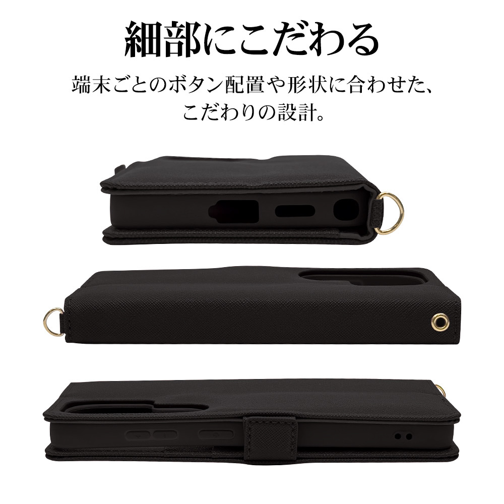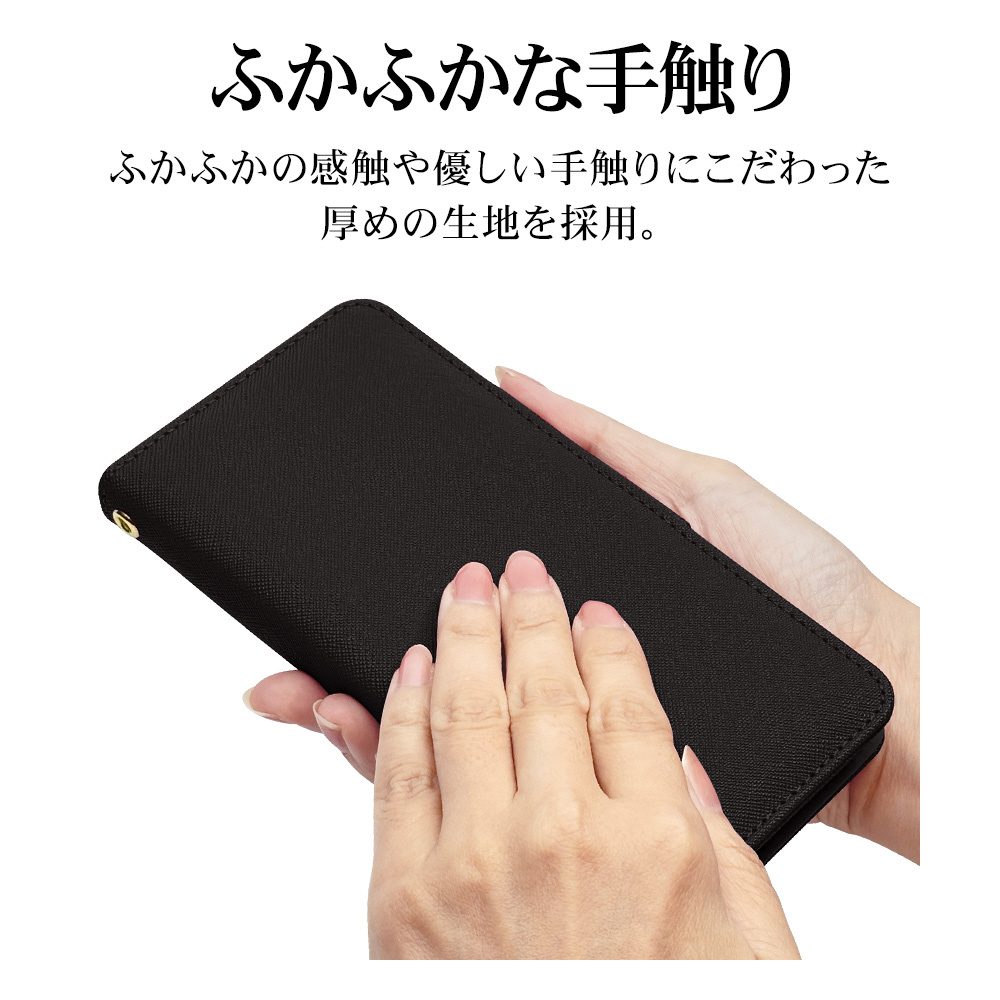 液晶画面側と背面側の両面を保護できるハンドストラップ付きの手帳型ケースです。