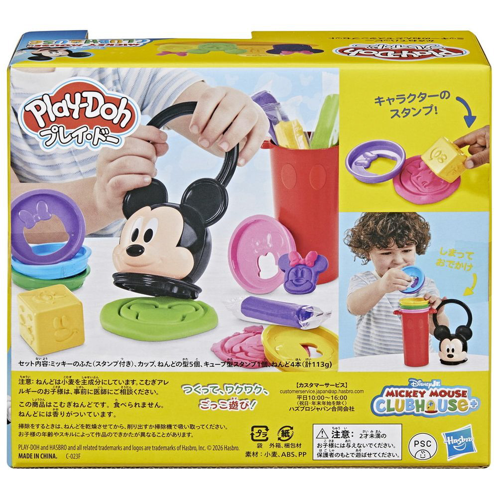 プレイセットには、ミッキーのふた(スタンプ付き)、カップ、ねんどの型5個、キューブ型スタンプ1個、ねんど4本が入っています。