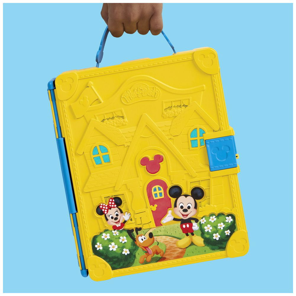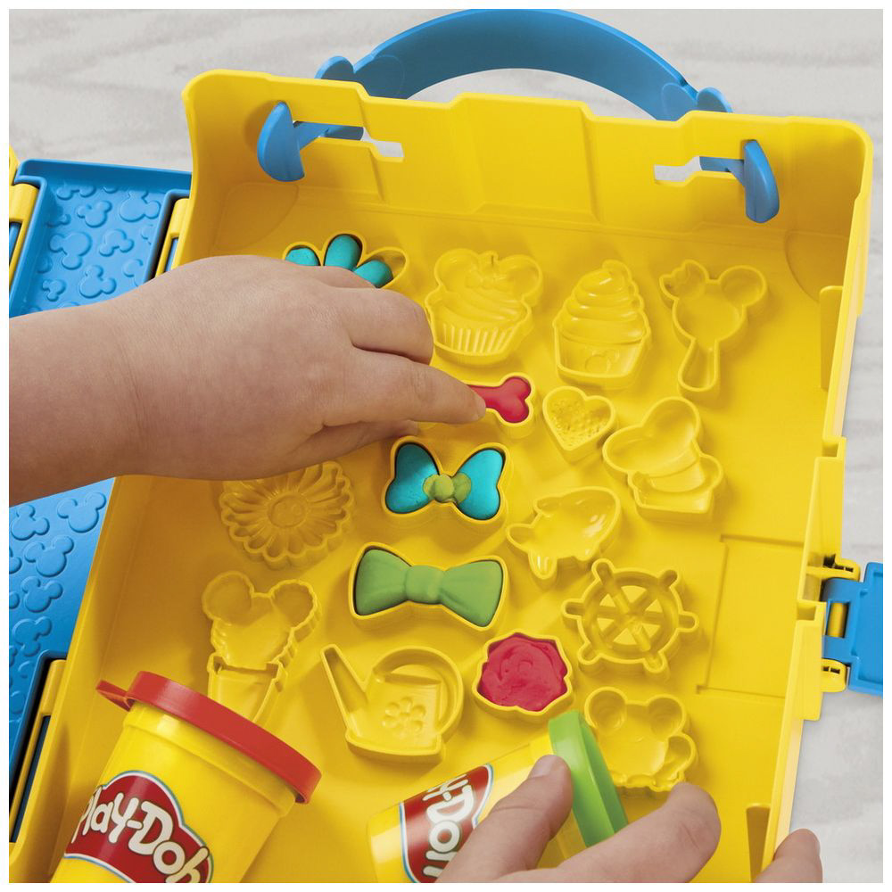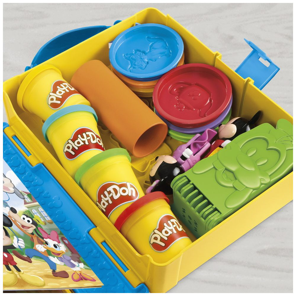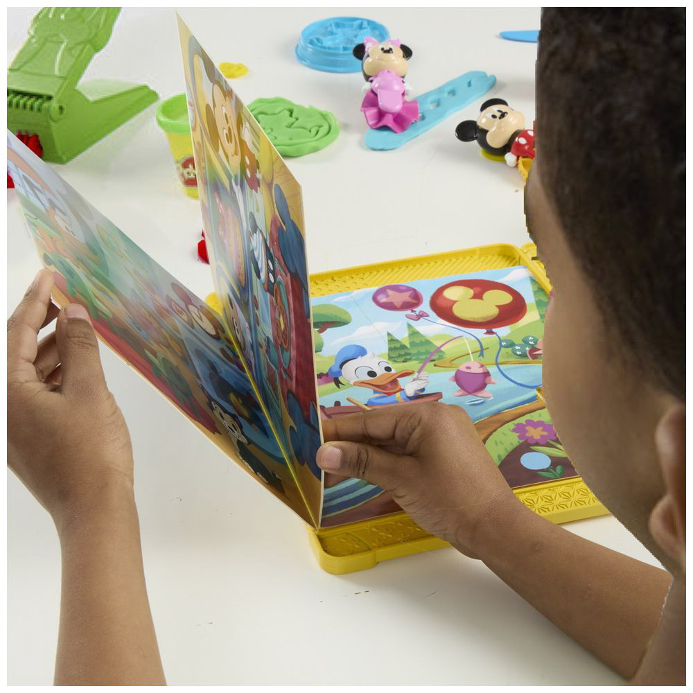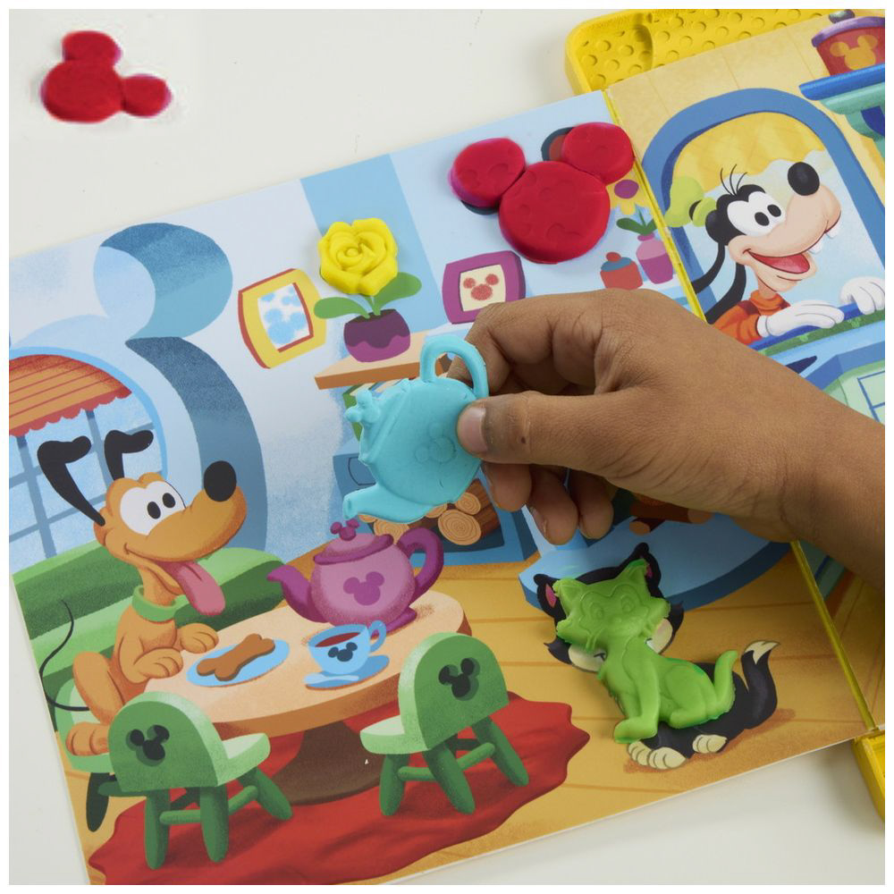 プレイセットには、絵本ケース、ミッキーのローラースタンプ、ミニーのローラーカッター、グーフィーのねんどツール、ローラー、ナイフ、ねんどの型6個、ねんど4個が入っています。