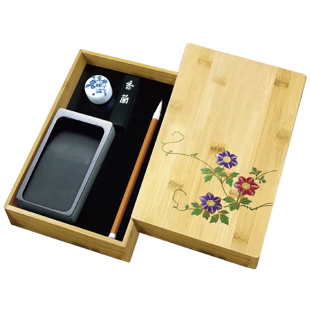素材:墨:煤・膠・香料/筆:ABS・羊毛・馬毛/硯:天然石/水差:陶器/硯箱:竹