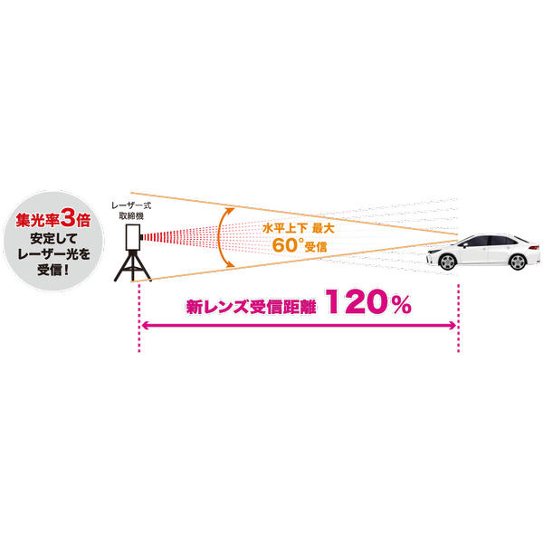 新設計のフレデリックスレンズと当社独自のシステムを合わせることで、赤外線やレーザー光を使用した機器など誤警報となりやすい受信とレーザー式オービスからのレーザー受信を高い確率で識別することが可能になりました。