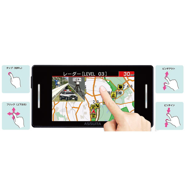 スマホのようにピンチイン、ピンチアウトで地図の拡大縮小ができたり、フリックで待受画面が選択できたりと、直感的な操作が可能です。
