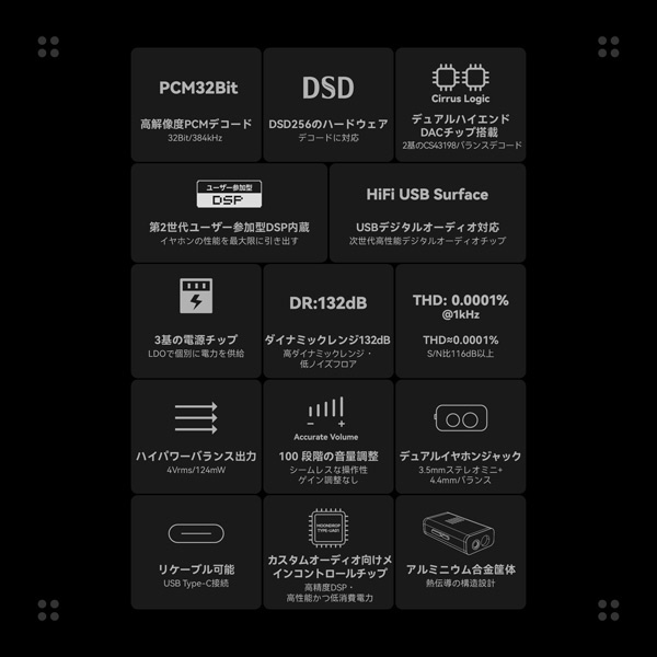 フラッグシップ級DACチップ「CS43198」を2基搭載、第2世代ユーザー参加型DSP内蔵のコンパクトなポータブルDACアンプです。