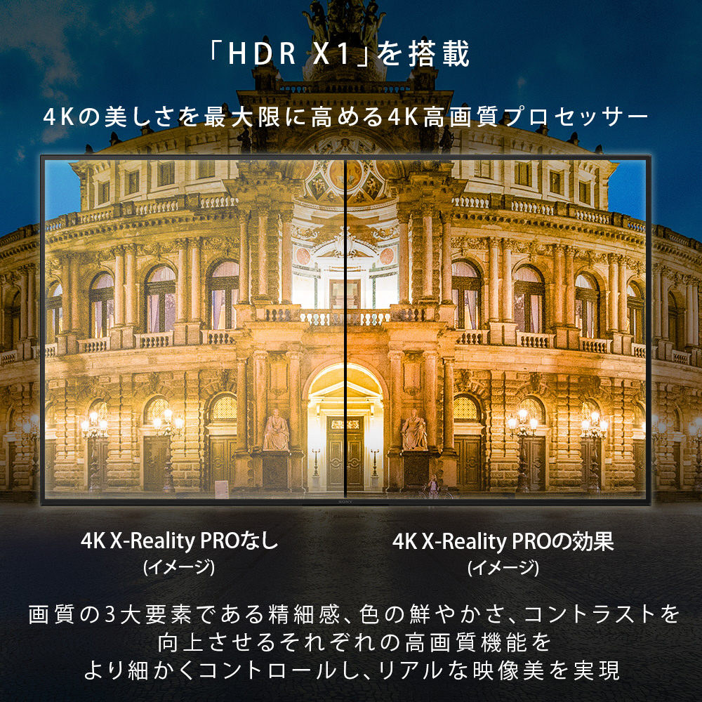 4Kの美しさを最大限に高める高画質プロセッサー「HDR X1(エイチディーアール エックスワン)」を搭載。画質の3大要素である精細感、色の鮮やかさ、コントラストを向上させるそれぞれの高画質機能をより細かくコントロールします。さらに、さまざまな映像を高コントラストなHDR相当の画質でリアルに描く「HDRリマスター」が映像の美しさを高めます。