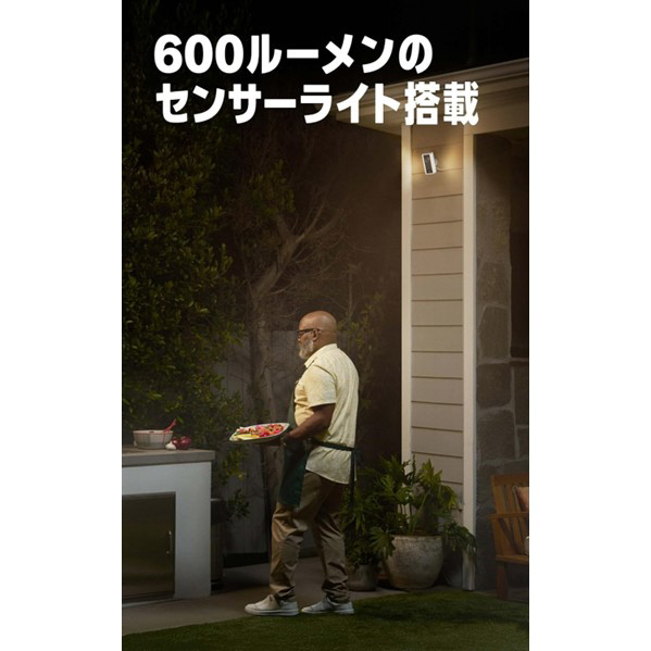 【センサーライト搭載】600ルーメンのセンサーライト搭載で暗いエリアもモーション検知時に灯す。暖かみのあるLEDライトは明るさもRingアプリで調整可能。