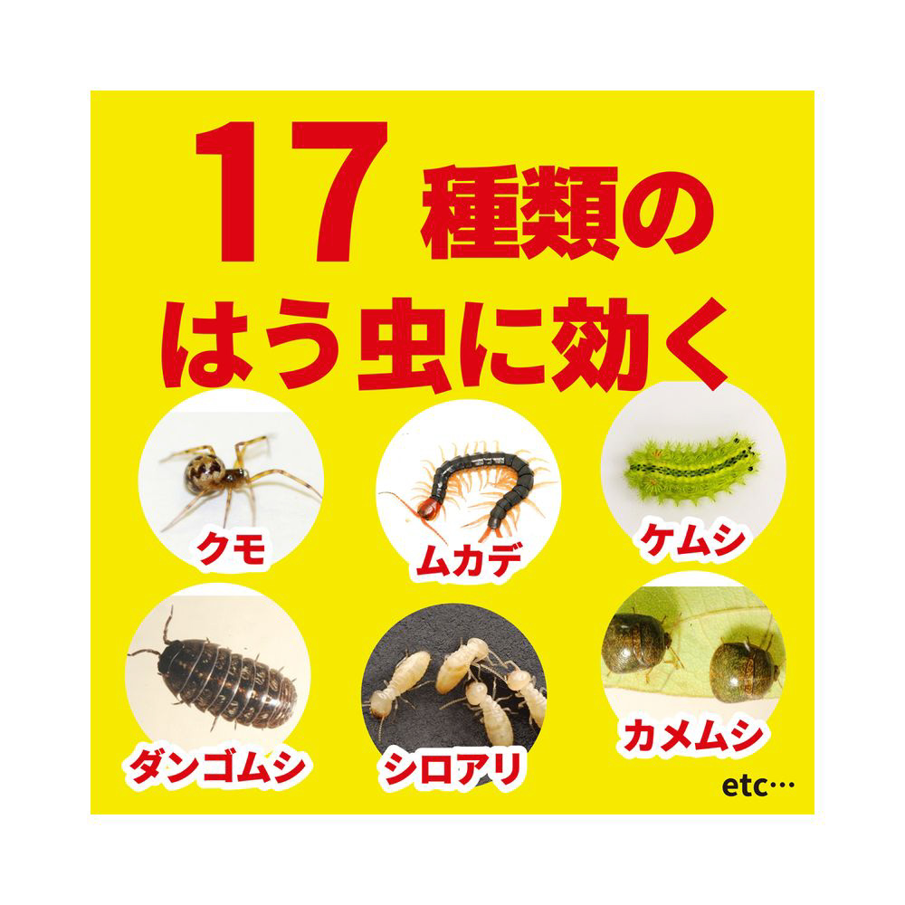 独自のW成分でいろんな虫に効く。【適用害虫】カメムシ、アリ、クモ、チャタテムシ、シバンムシ、カツオブシムシ、ユスリカ、ヤスデ、チョウバエ、コクゾウムシ、ゲジゲジ、ダンゴムシ、ガ、コバエ