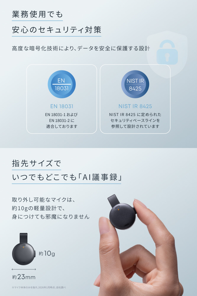 世界最小・最軽量※のウェアラブルAIボイスレコーダーで、商談メモ、会議の議事録などにかかる時間を節約できます。※マイク本体のみを指す。2026年1月時点、自社調べ