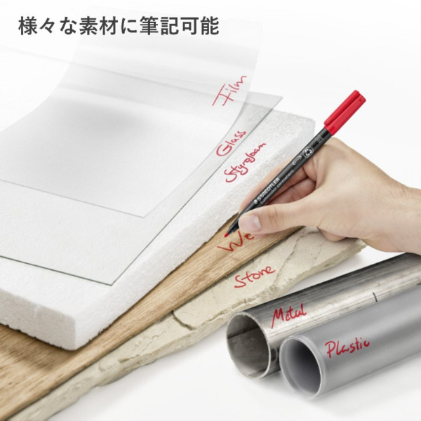 ガラス・陶器・金属・プラスチック・木材・布・OHPフィルムなど様々なものに書けます。また独自のインクがペン先に薄い皮膜を作り、2日間はペン先の乾燥を防ぎます。(※ISO554)筆記後、3〜6秒程で乾き、すばやい作業にも最適です。