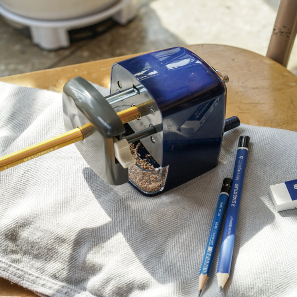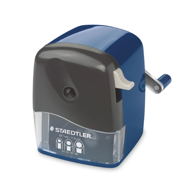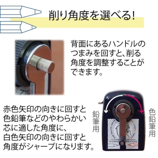 六角軸、三角軸、丸軸などの形状、また、7〜11.6mmまでの太さの鉛筆や色鉛筆が削れる本格式の手動シャープナー。