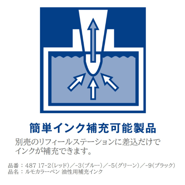 ルモカラー油性ペンは、優れた定着性で、ガラス・陶器・OHPフィルムなど様々なモノに書くことができます。ドライセーフインクがペン先に薄い皮膜を作り、2日間ペン先の乾燥を防ぎます。