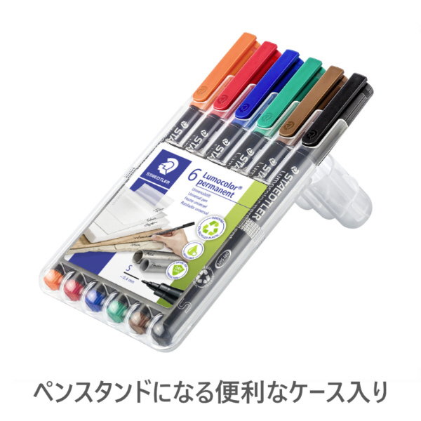 ガラス・陶器・金属・プラスチック・木材・布・OHPフィルムなど様々なものに書けます。また独自のインクがペン先に薄い皮膜を作り、2日間はペン先の乾燥を防ぎます。(※ISO554)筆記後、3〜6秒程で乾き、すばやい作業にも最適です。ペンスタンドになるステッドラーボックス入り。