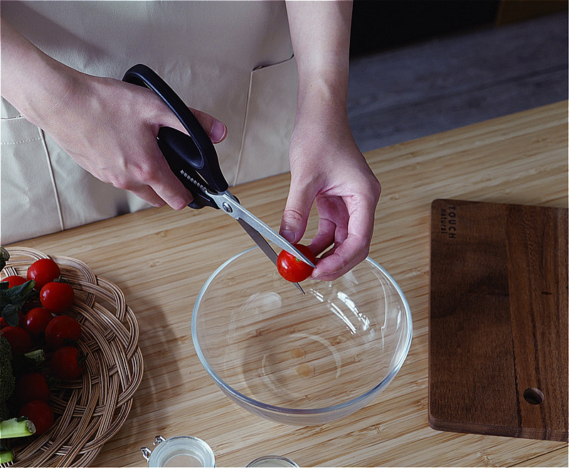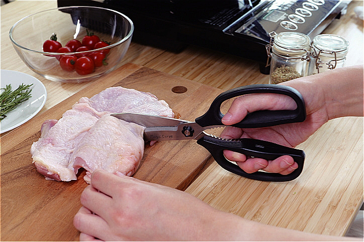 マジックカーブ刃、至高の切れ味。細かいギザ刃が食材に食い込む衝撃吸収。樹脂ワッシャーやわらかハンドル。つけ置き洗いはしないでください。
