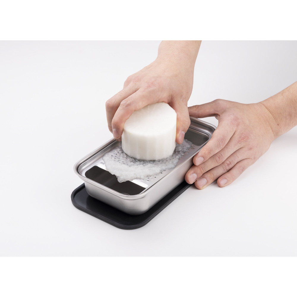 軽い力でおろせて、洗いやすいおろし器。目立てと配置を工夫し、食材を軽い力でスムーズにおろせる設計。洗いやすく、日常使いにも清潔で便利。三角錐の目立て形状は特許(No7595967)構造。滑りにくく安定した使い心地。シリコンカバーがしっかりと本体を固定し、滑りを防止。安心して力をかけられる安定感のあるおろし器。清潔さが続くステンレス製。樹脂に比べて臭いや色移り、傷がつきにくく、長く清潔な状態を保てる衛生的なおろし器。収納時も安心なシリコーン製カバー。使用後はシリコーン製カバーが本体を包み込み、目立て部を保護。安全かつ快適に収納できる設計。