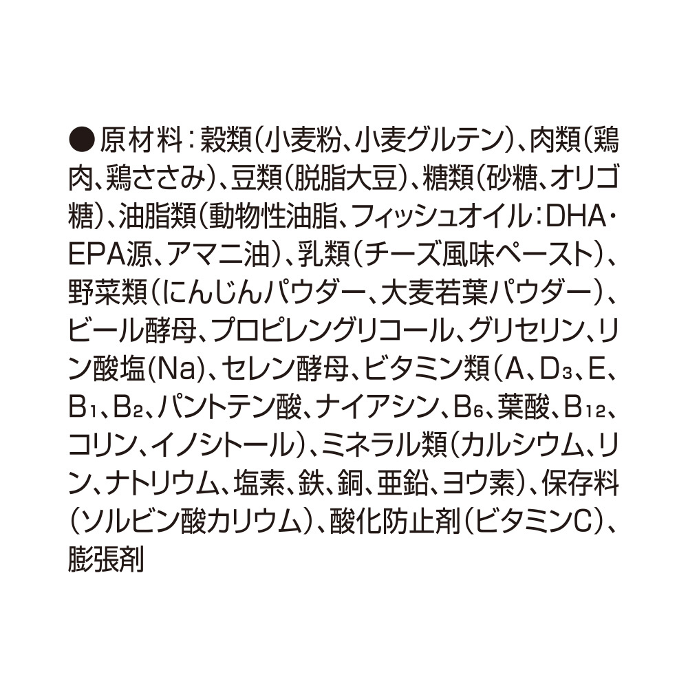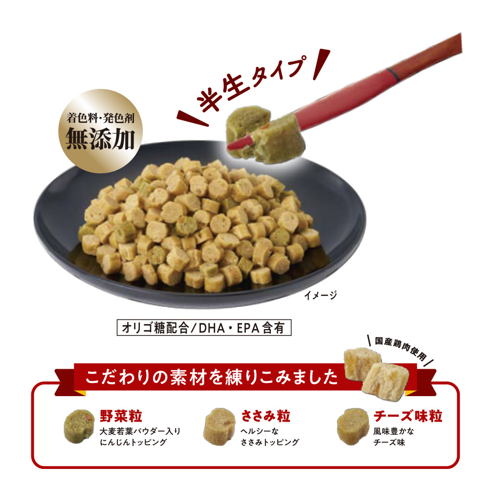 ささみトッピングが練りこまれた「ささみ粒」と風味豊かな「チーズ味粒」。オリゴ糖が腸内フローラを整え、健康を維持することにより免疫力を保つ。