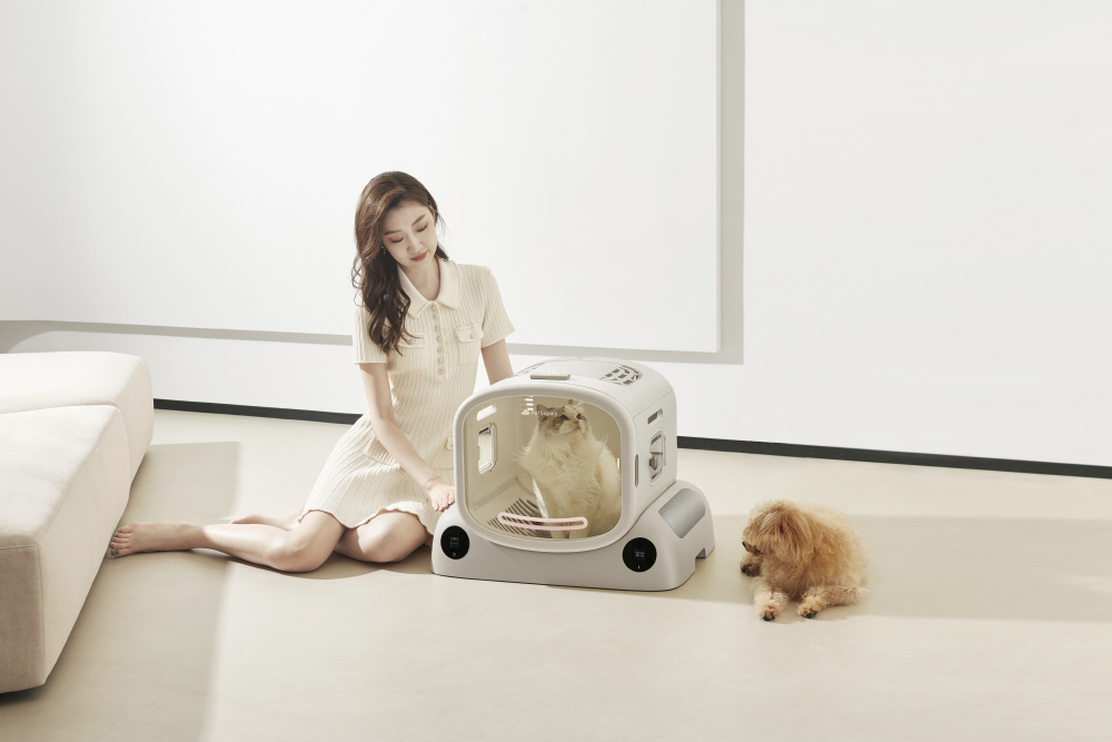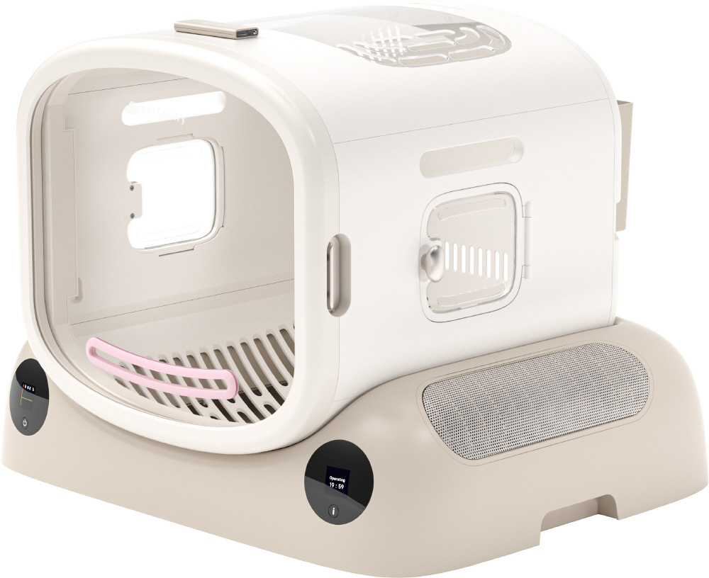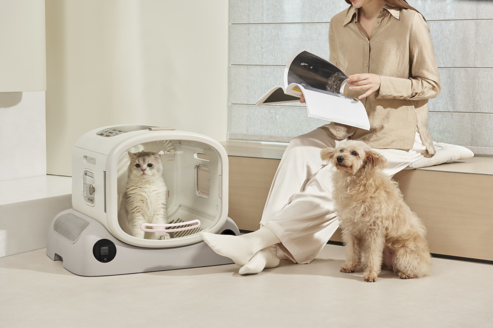 底面からの大風量温風 底面の台座部に2つのファン(デュアルクロスフローブラシレスファン)を搭載し、お腹や足裏、しっぽなど通常のドライヤーでは乾かしにくい部分もムラなく素早く乾燥できます。 乾燥時間の短縮 短毛の猫は約10〜13分、長毛の猫でも40分前後で乾燥可能です。 広々とした80Lの居室 80Lの大容量で、2匹まで同時に乾燥できるため多頭飼いにも対応。ペットがリラックスできる広さです。 温度・風量調整 風量は10段階、温度は30〜42℃の範囲で11段階調整が可能。ペットの毛の長さや体格、季節に合わせて細かく設定できます。