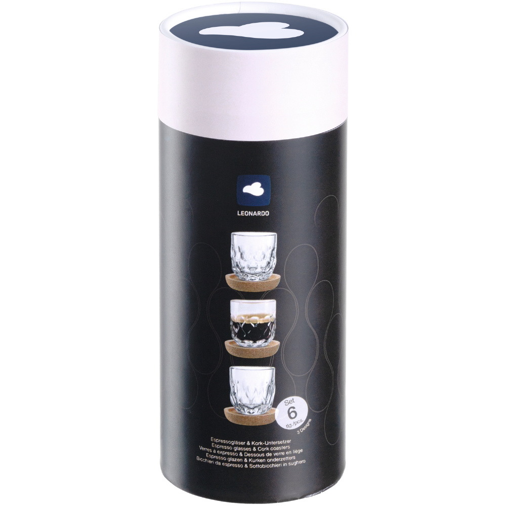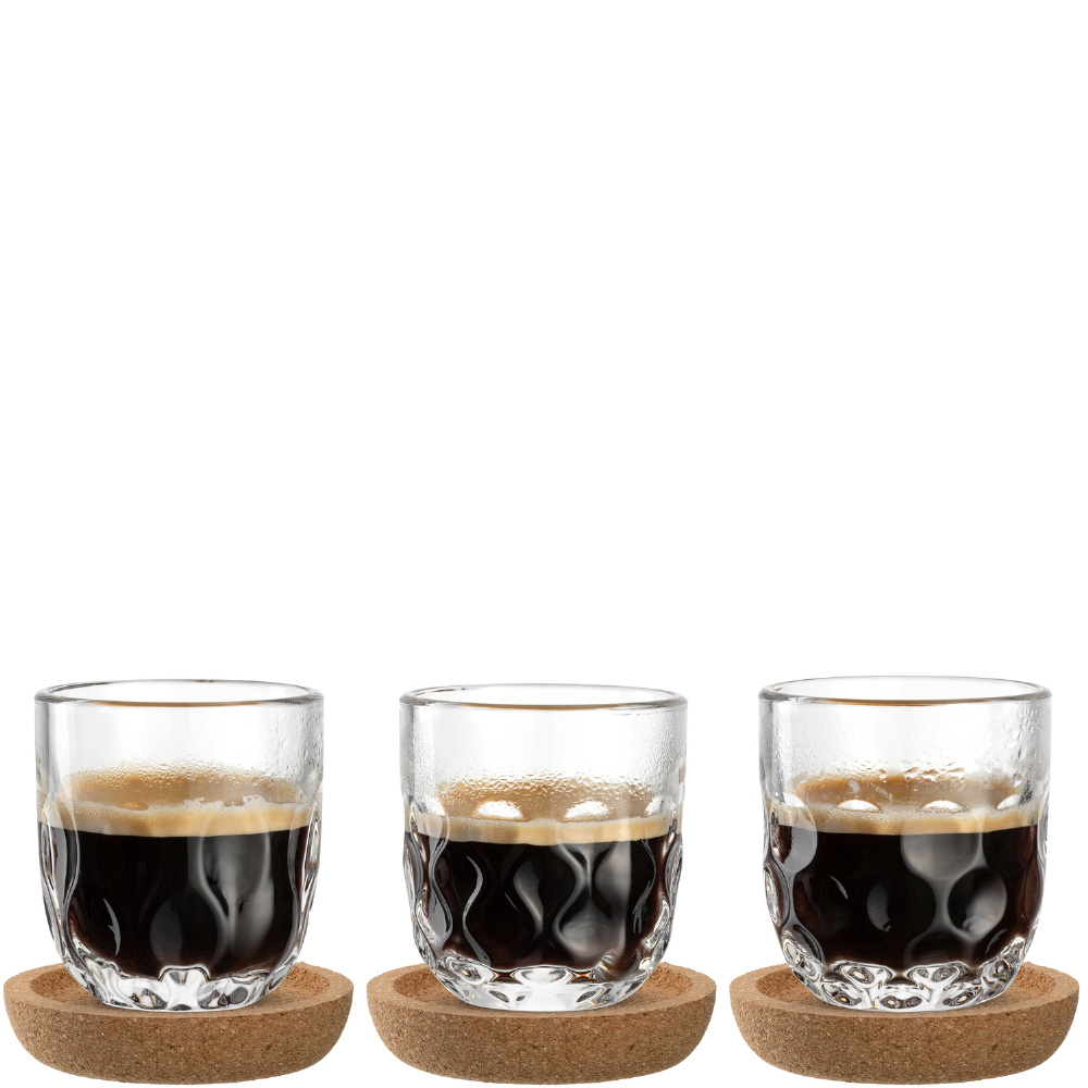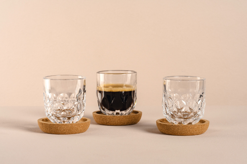 GOCCEのエスプレッソグラスセットで、スタイリッシュにコーヒータイムを。柔らかなフォルムと優雅な滴のレリーフが、一口ごとに特別な体験を演出します。異なる3種のデザインのグラスと、3枚のコルクコースター付きでテーブルもおしゃれに保護。エスプレッソ好きにぴったりの上質セットです。
