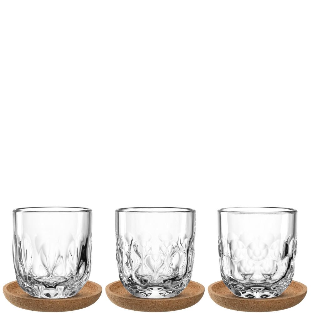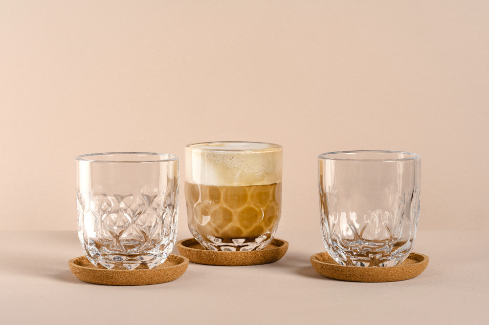 やわらかな曲線としずく模様が美しいGOCCEコーヒーグラス。異なるデザインの3個セットで、コーヒータイムをより多彩に演出します。カプチーノにもフィルターコーヒーにもぴったり。付属のコルクコースターでテーブルを守りながら、上質なアクセントもプラス。