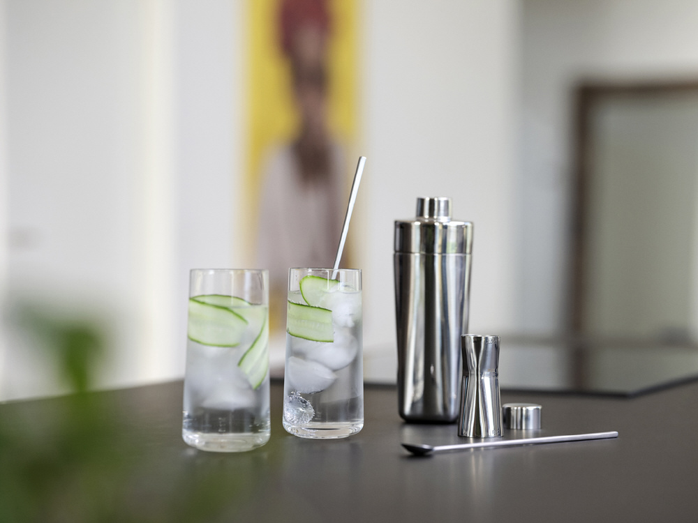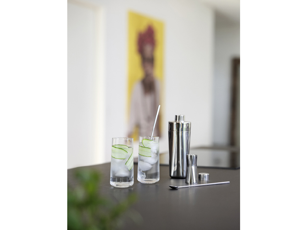 氷がとける瞬間の美しさを表現した「Rocks」バーセットは、デンマークのデザインユニット〈Mavro//Lef_vre〉による洗練された逸品。シェーカーは400mlで、蓋にフィルターを内蔵。ジガーは2.5clと5clの計量が可能で、使いやすさも抜群です。高光沢ステンレスの質感が、日常を一段と格上げし、自宅で本格的なカクテル体験を叶えます。